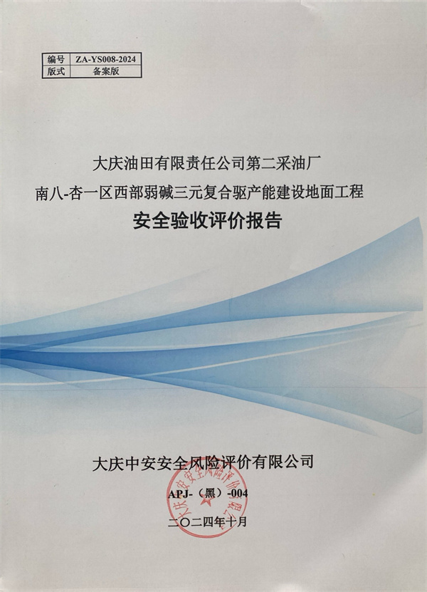 大慶油田有限責(zé)任公司第二采油廠南八-杏一區(qū)西部弱堿三元復(fù)合驅(qū)產(chǎn)能建設(shè)地面工程安全驗(yàn)收評價(jià)報(bào)告
