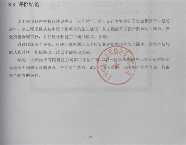 大慶油田有限責(zé)任公司第二采油廠南八-杏一區(qū)西部弱堿三元復(fù)合驅(qū)產(chǎn)能建設(shè)地面工程安全設(shè)施符合“三同時(shí)”要求,試運(yùn)行情況良好,安全生產(chǎn)管理有效,具備安全驗(yàn)收的條件。