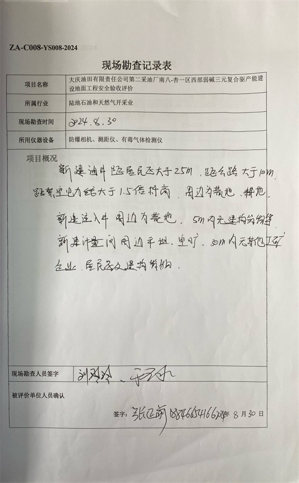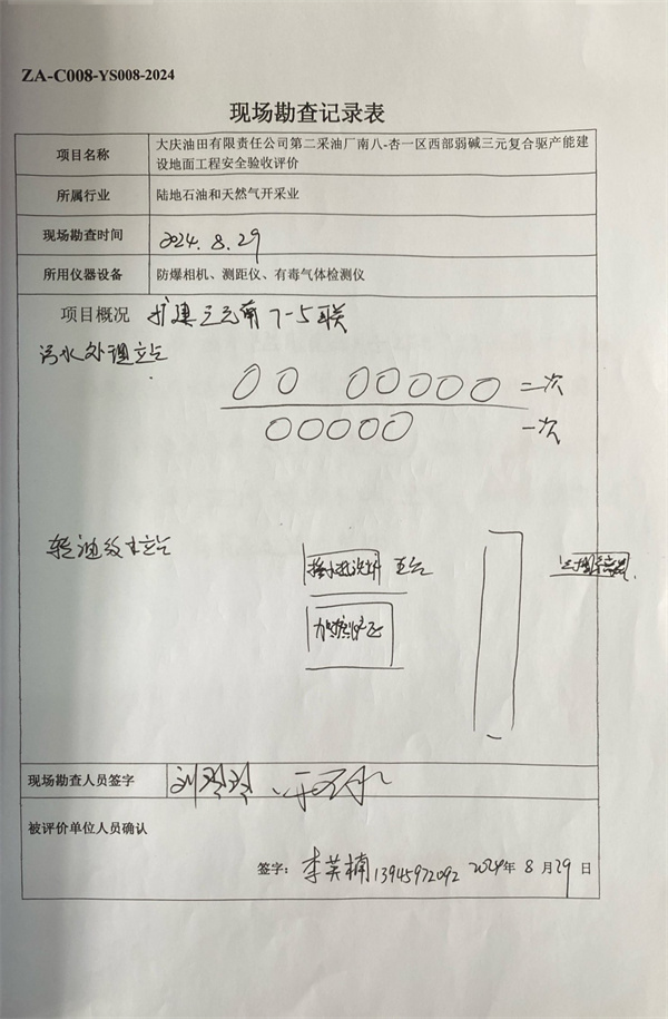 大慶油田有限責(zé)任公司第二采油廠南八-杏一區(qū)西部弱堿三元復(fù)合驅(qū)產(chǎn)能建設(shè)地面工程安全驗(yàn)收評價(jià)