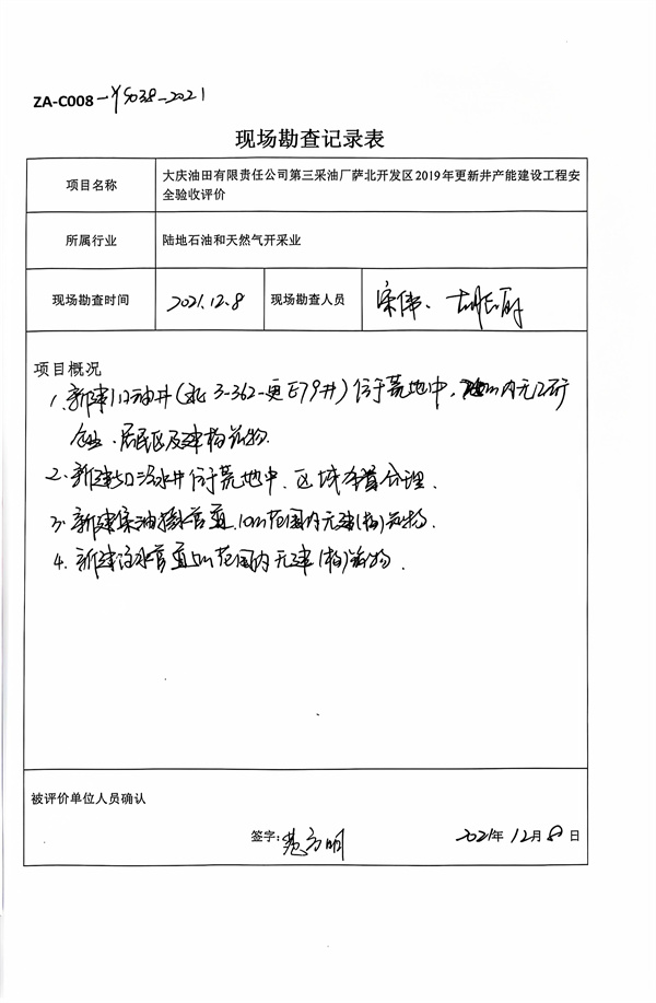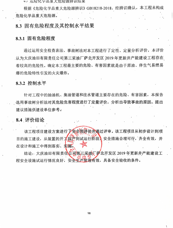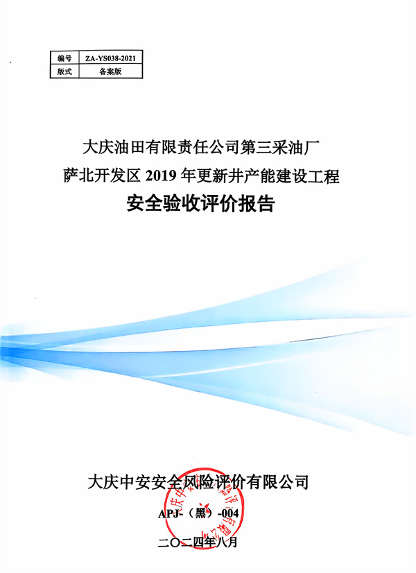 大慶油田有限責(zé)任公司第三采油廠薩北開發(fā)區(qū)2019年更新井產(chǎn)能建設(shè)工程安全驗(yàn)收評價(jià)報(bào)告 |