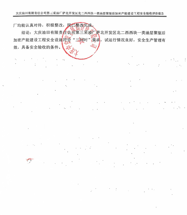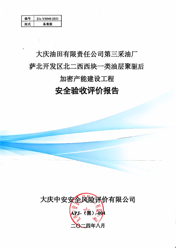 大慶油田有限責任公司第三采油廠薩北開發(fā)區(qū)北二西西塊一類油層聚驅(qū)后加密產(chǎn)能建設(shè)工程安全驗收評價報告