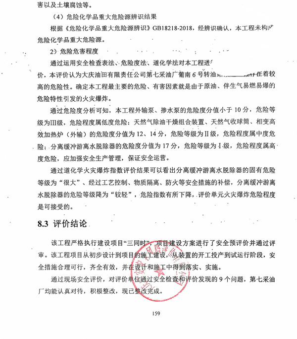 該工程嚴格執(zhí)行建設項目“三同時”,項目建設方案進行了安全預評價并通過評審。該工程項目從初步設計到項目的施工建設,從裝置的開工投產到試運行階段,安全措施合理可行,齊全有效,并在設計和施工中得到落實、實施。 通過現場安全評價,對評價單位通過安全檢查和評價發(fā)現的9個問題,第七采油廠均能認真對待,積極整改,現已整改完成。 結論:大慶油田有限責任公司第七采油廠葡南6號轉油站改造工程安全設施符合“三同時”要求,試運行情況良好,安全生產管理有效,具備安全驗收的條件。 |
