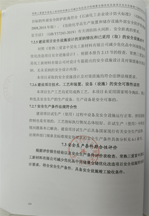 常熟三愛(ài)富中昊化工新材料有限公司減少?;分虚g儲(chǔ)量倉(cāng)儲(chǔ)優(yōu)化改造項(xiàng)目安全設(shè)施符合設(shè)計(jì)要求,符合安全生產(chǎn)條件,具備安全設(shè)施竣工驗(yàn)收條件