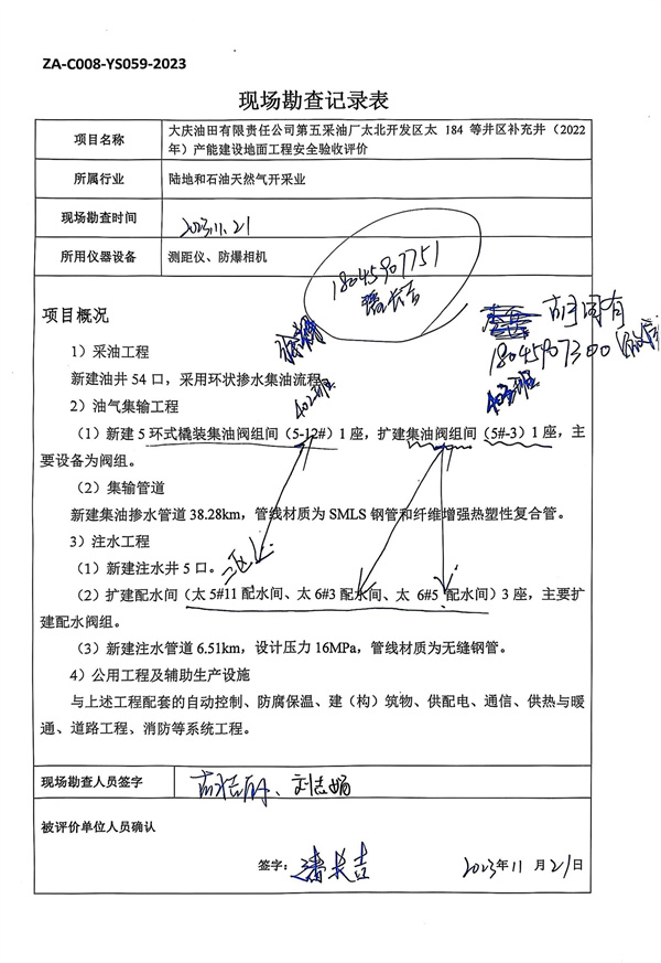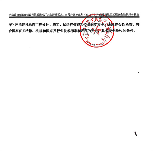 大慶油田有限責(zé)任公司第五采油廠太北開發(fā)區(qū)太184等井區(qū)補充井(2022年)產(chǎn)能建設(shè)地面工程設(shè)計、施工、試運行管理和監(jiān)督制度齊全,通過符合性檢查,符合國家有關(guān)法律、法規(guī)和國家及行業(yè)技術(shù)標(biāo)準(zhǔn)和規(guī)范的要求,具備安全驗收的條件。 |