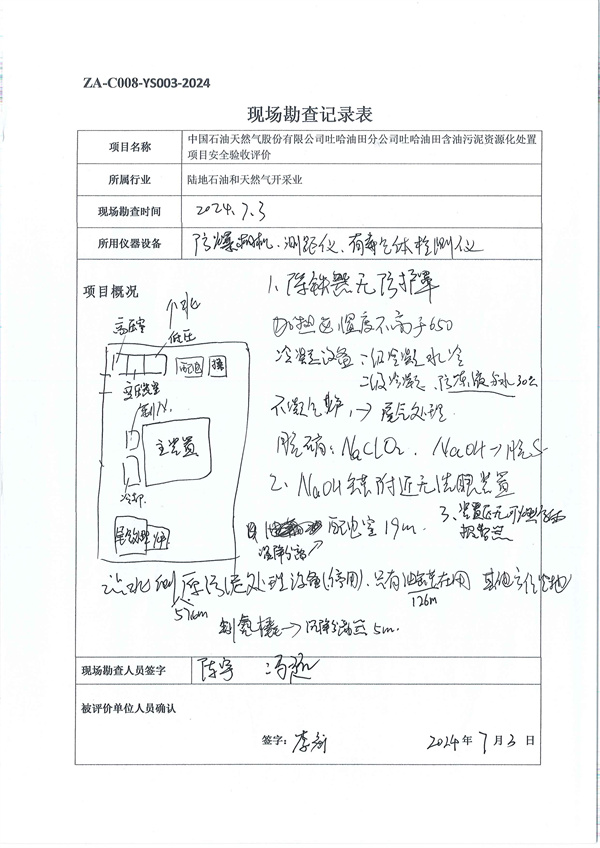 綜上所述,評(píng)價(jià)單位認(rèn)為:中國石油天然氣股份有限公司吐哈油田分公司吐哈油田含油污泥資源化處置項(xiàng)目設(shè)計(jì)、施工、試運(yùn)行管理和監(jiān)督制度齊全,安全設(shè)施與主體工程同時(shí)設(shè)計(jì)、同時(shí)施工、同時(shí)投入生產(chǎn)和使用,經(jīng)過符合性檢查,符合法律、法規(guī)和標(biāo)準(zhǔn)規(guī)范的要求。評(píng)價(jià)組對(duì)現(xiàn)場(chǎng)進(jìn)行勘察,共發(fā)現(xiàn)2處安全隱患,鄯善采油管理區(qū)已對(duì)隱患進(jìn)行整改,該工程試運(yùn)行情況良好,安全生產(chǎn)管理有效,該工程具備安全驗(yàn)收的條件。