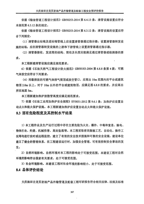 大慶油田古龍頁(yè)巖油產(chǎn)品外輸管道及配套工程可研報(bào)告符合相關(guān)法律、法規(guī)及標(biāo)準(zhǔn)規(guī)范對(duì)安全生產(chǎn)的要求。建設(shè)單位應(yīng)在其今后的設(shè)計(jì)、施工和運(yùn)行中進(jìn)一步落實(shí)本工程可研報(bào)告提出的安全技術(shù)措施和本次預(yù)評(píng)價(jià)提出的補(bǔ)充安全措施,確實(shí)保證工程安全設(shè)施和主體工程的“三同時(shí)”,并在工程竣工投產(chǎn)后切實(shí)加強(qiáng)安全生產(chǎn)管理,以實(shí)現(xiàn)工程安全、平穩(wěn)運(yùn)行,建成投產(chǎn)后可以達(dá)到安全生產(chǎn)的目的。 |