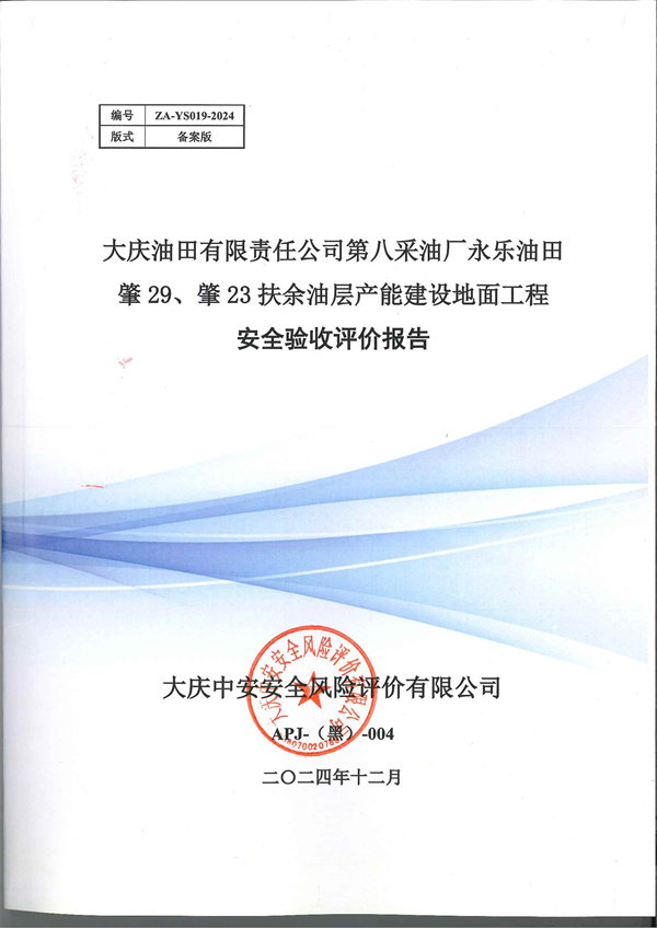 大慶油田有限責(zé)任公司第八采油廠永樂(lè)油田肇29、肇23扶余油層產(chǎn)能建設(shè)地面工程安全驗(yàn)收評(píng)價(jià)報(bào)告