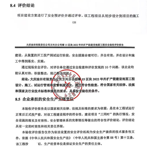 大慶油田有限責(zé)任公司方興分公司肇15區(qū)塊2022年外擴產(chǎn)能建設(shè)地面工程設(shè)計、施工、試運行管理和監(jiān)督制度齊全,通過符合性檢查,符合國家有關(guān)法律、法規(guī)和國家及行業(yè)技術(shù)標準和規(guī)范的要求,具備安全驗收的條件。