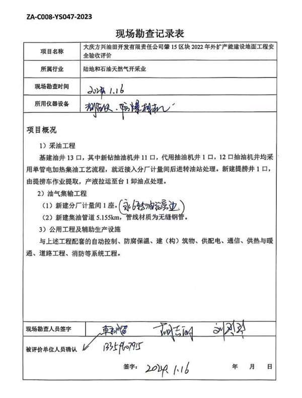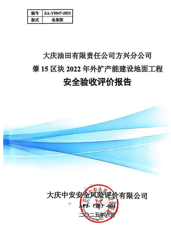 大慶油田有限責(zé)任公司方興分公司肇15區(qū)塊2022年外擴產(chǎn)能建設(shè)地面工程安全驗收評價