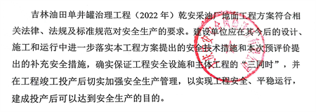 吉林油田單井罐治理工程(2022年)乾安采油廠地面工程方案符合相關(guān)法律、法規(guī)及標(biāo)準(zhǔn)規(guī)范對安全生產(chǎn)的要求。建設(shè)單位應(yīng)在其今后的設(shè)計(jì)、施工和運(yùn)行中進(jìn)一步落實(shí)本工程方案提出的安全技術(shù)措施和本次預(yù)評價(jià)提出的補(bǔ)充安全措施,確實(shí)保證工程安全設(shè)施和主體工程的“三同時(shí)”,并在工程竣工投產(chǎn)后切實(shí)加強(qiáng)安全生產(chǎn)管理,以實(shí)現(xiàn)工程安全、平穩(wěn)運(yùn)行,建成投產(chǎn)后可以達(dá)到安全生產(chǎn)的目的。 |