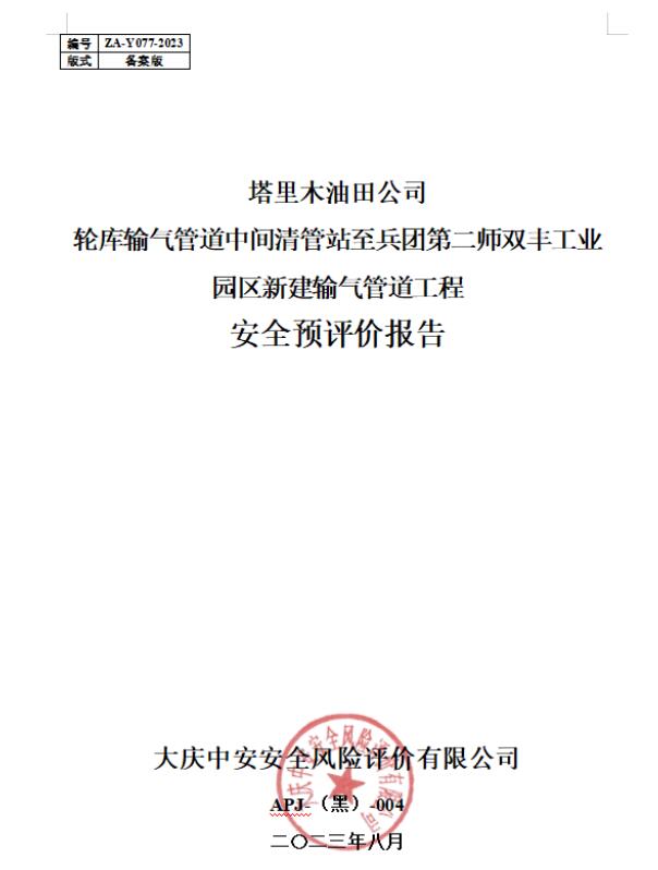 塔里木油田公司輪庫輸氣管道中間清管站至兵團第二師雙豐工業(yè)園區(qū)新建輸氣管道工程安全預評價報告