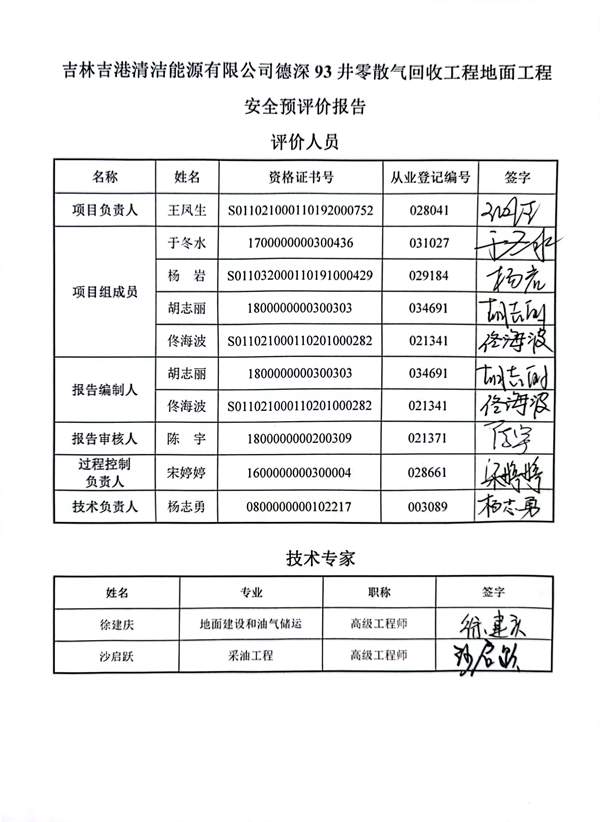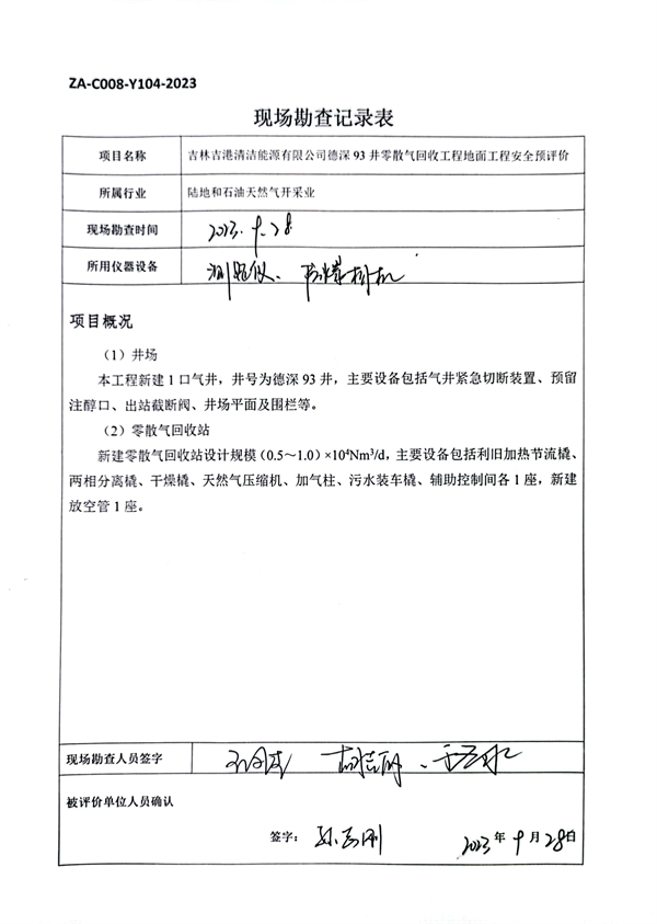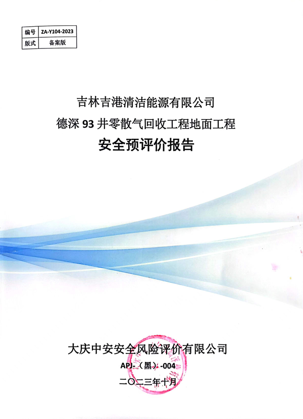 吉林吉港清潔能源有限公司德深93井零散氣回收工程地面工程安全預(yù)評價