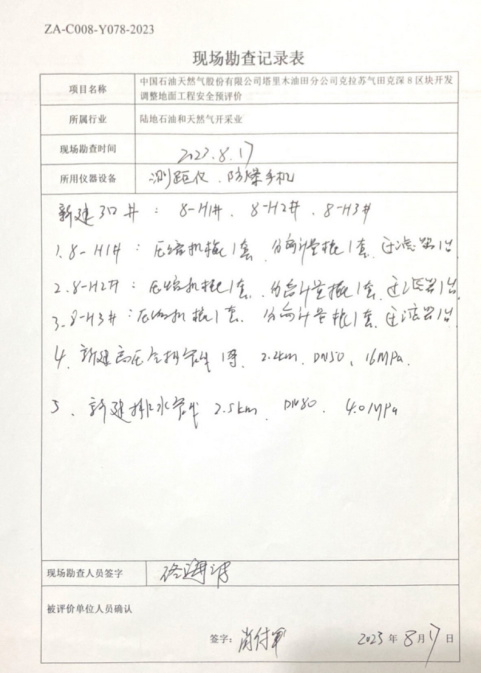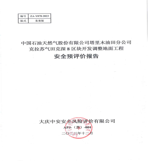 中國石油天然氣股份有限公司塔里木油田分公司克拉蘇氣田克深8區(qū)塊開發(fā)調(diào)整地面工程安全預(yù)評價報告
