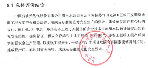 中國石油天然氣股份有限公司塔里木油田分公司克拉蘇氣田克深8區(qū)塊開發(fā)調(diào)整地面工程方案符合相關(guān)法律、法規(guī)及標(biāo)準(zhǔn)規(guī)范對安全生產(chǎn)的要求。建設(shè)單位應(yīng)在其今后的設(shè)計、施工和運行中進(jìn)一步落實本工程方案提出的安全技術(shù)措施和本次預(yù)評價提出的補充安全措施,確實保證工程安全設(shè)施和主體工程的“三同時”,并在工程竣工投產(chǎn)后切實加強安全生產(chǎn)管理,以實現(xiàn)工程安全、平穩(wěn)運行,本項目危險有害因素能夠得到控制,建成投產(chǎn)后,能達(dá)到有關(guān)法律、法規(guī)及標(biāo)準(zhǔn)規(guī)定的安全要求。