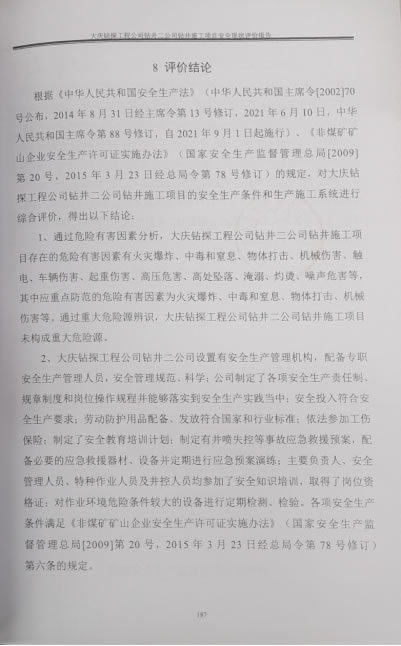 大慶鉆探工程公司鉆井二公司20200909日取得黑龍江省應(yīng)急管理廳頒發(fā)的非煤礦山企業(yè)安全生產(chǎn)許可證延期換證,許可范圍:鉆井,許可證編號(hào):黑FM安許證字[2020]DQ0020號(hào)。自2020年安全生產(chǎn)許可證延期換證至今,近三年生產(chǎn)過程中未發(fā)生重大傷亡事故。通過以上分析評(píng)價(jià),本報(bào)告認(rèn)為大慶鉆探工程公司鉆井二公司鉆井施工項(xiàng)目符合安全生產(chǎn)條件的要求。