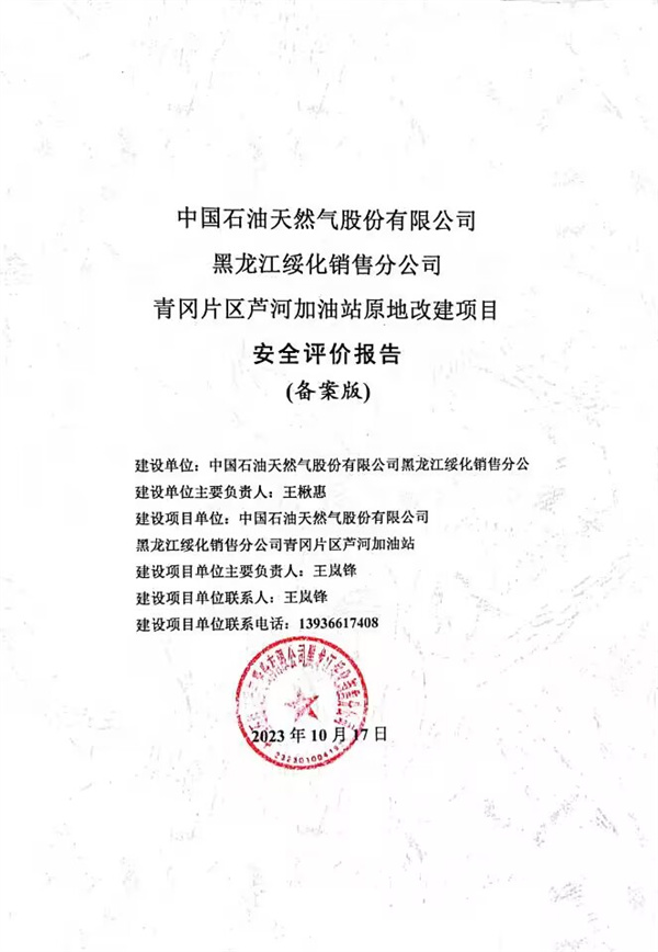 中國石油天然氣股份有限公司黑龍江綏化銷售分公司青岡片區(qū)蘆河加油站原地改建項(xiàng)目安全預(yù)評(píng)價(jià)