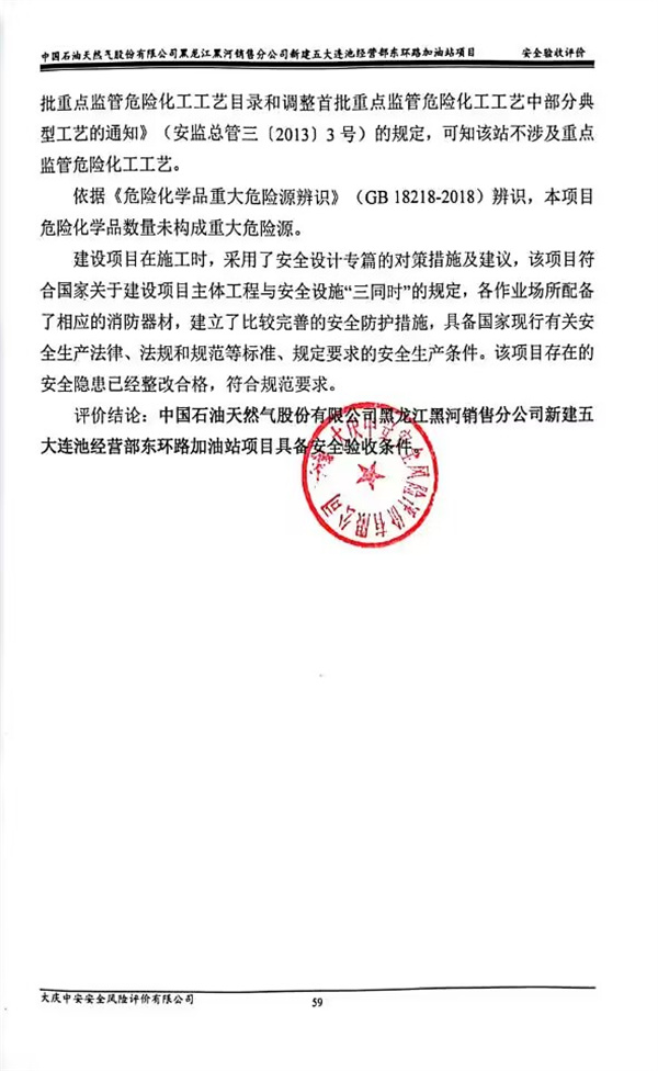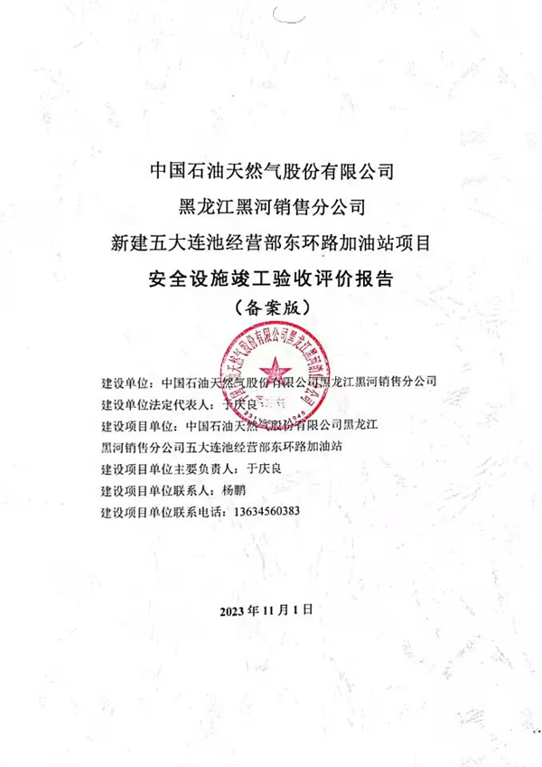 中國石油天然氣股份有限公司黑龍江黑河銷售分公司新建五大連池經(jīng)營部東環(huán)路加油站項(xiàng)目具備安全驗(yàn)收條件。 |