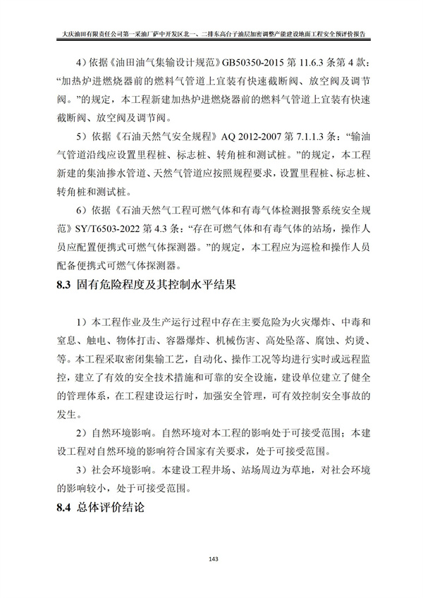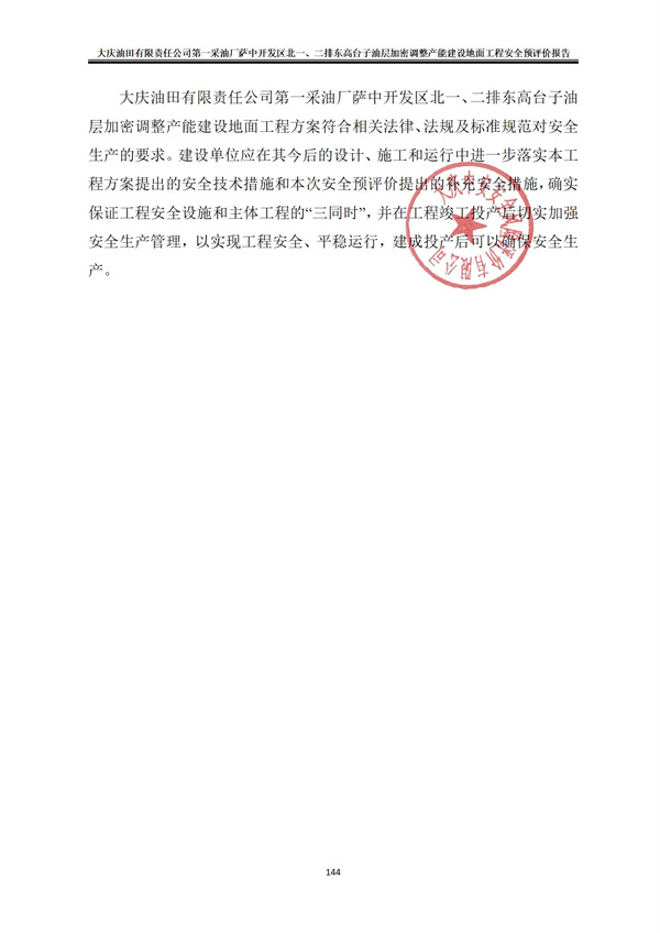 大慶油田有限責任公司第一采油廠薩中開發(fā)區(qū)北一、二排東高臺子油層加密調整產能建設地面工程方案符合相關法律、法規(guī)及標準規(guī)范對安全生產的要求。建設單位應在其今后的設計、施工和運行中進一步落實本工程方案提出的安全技術措施和本次安全預評價提出的補充安全措施,確實保證工程安全設施和主體工程的“三同時”,并在工程竣工投產后切實加強安全生產管理,以實現(xiàn)工程安全、平穩(wěn)運行,建成投產后可以確保安全生產。 |