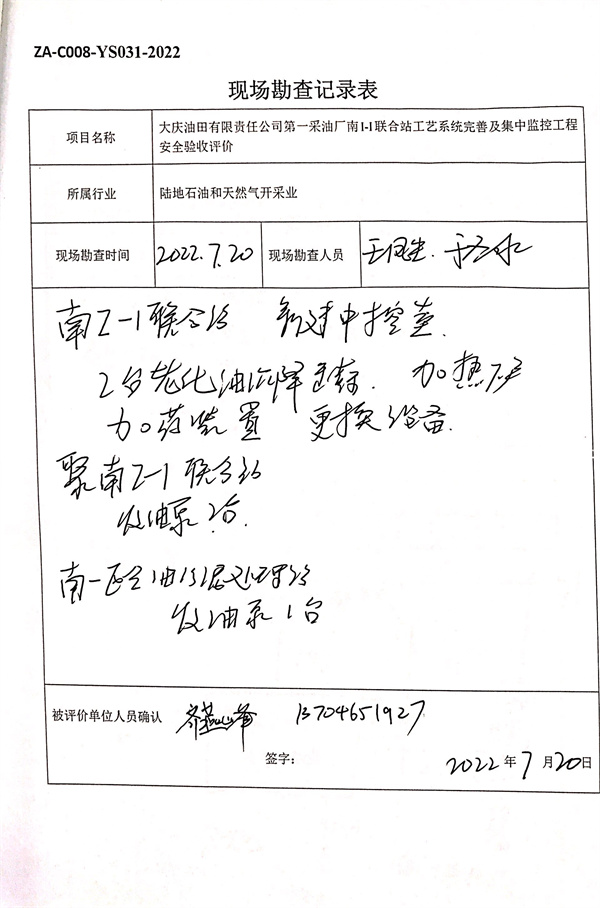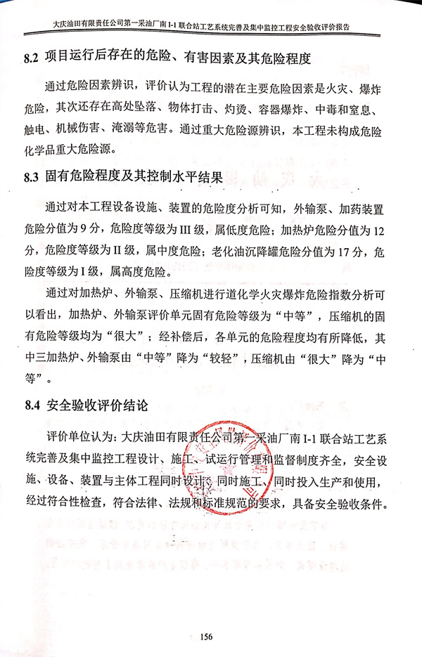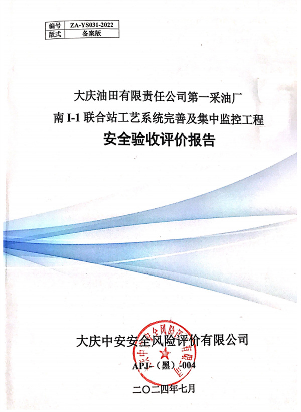大慶油田有限責(zé)任公司第一采油廠南I-I聯(lián)合站工藝系統(tǒng)完善及集中監(jiān)控工程安全驗(yàn)收評(píng)價(jià)報(bào)告 |