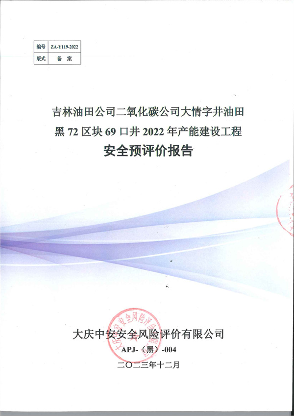 吉林油田二氧化碳開發(fā)公司大情字井油田黑72區(qū)塊69口井2022年產(chǎn)能建設(shè)工程安全預(yù)評價報告