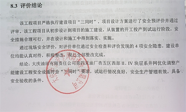 結(jié)論:大慶油田有限責(zé)任公司第四采油廠杏五區(qū)西部II、IV塊層系井網(wǎng)優(yōu)化調(diào)整產(chǎn)能建設(shè)工程安全設(shè)施符合“三同時(shí)”要求,試運(yùn)行情況良好,安全生產(chǎn)管理有效,具備安全驗(yàn)收的條件。 |