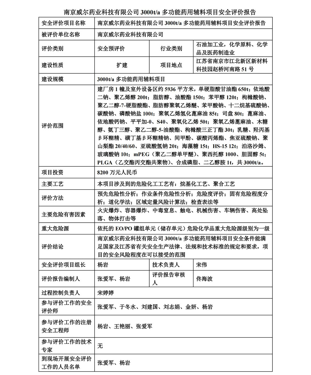 南京威爾藥業(yè)科技有限公司3000t/a多功能藥用輔料項目安全評價報告