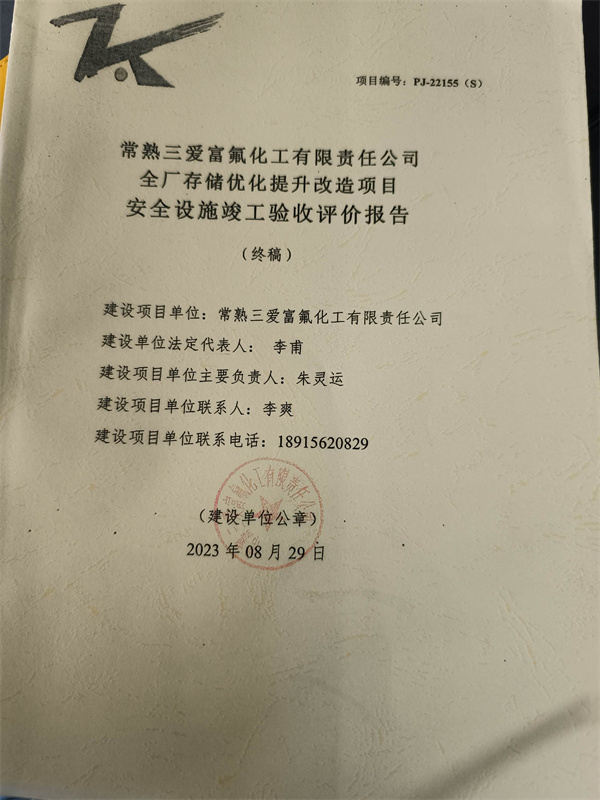 常熟三愛富氟化工有限責(zé)任公司 全廠存儲(chǔ)優(yōu)化提升改造項(xiàng)目安全設(shè)施竣工驗(yàn)收評價(jià)報(bào)告